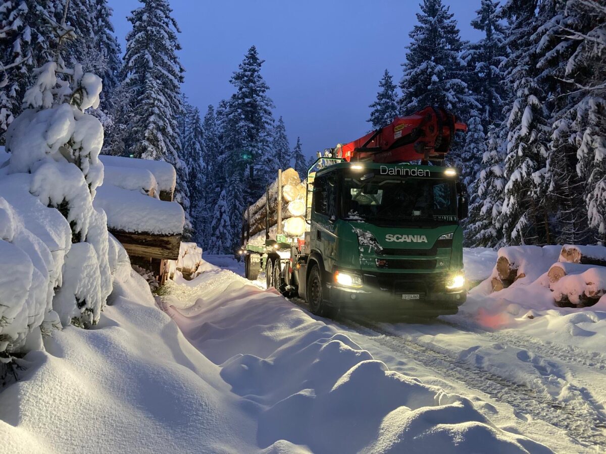 Mit unserem betriebseigenen Rundholzfahrzeug holen wir das Holz direkt aus den Schweizer Wäldern ab und bringen es zum Sägewerk Dahinden. Gerade im Winter erfordert das viel Erfahrung und eine präzise Fahrweise, denn die Wege zu den Holzlagern sind oft schneebedeckt, eng und anspruchsvoll.