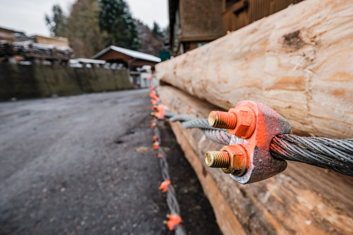 Die Holzbohlen, das Stahlseil wie die Briden sind periodisch zu überprüfen. Die Laschen sind keine Aufhängevorrichtung